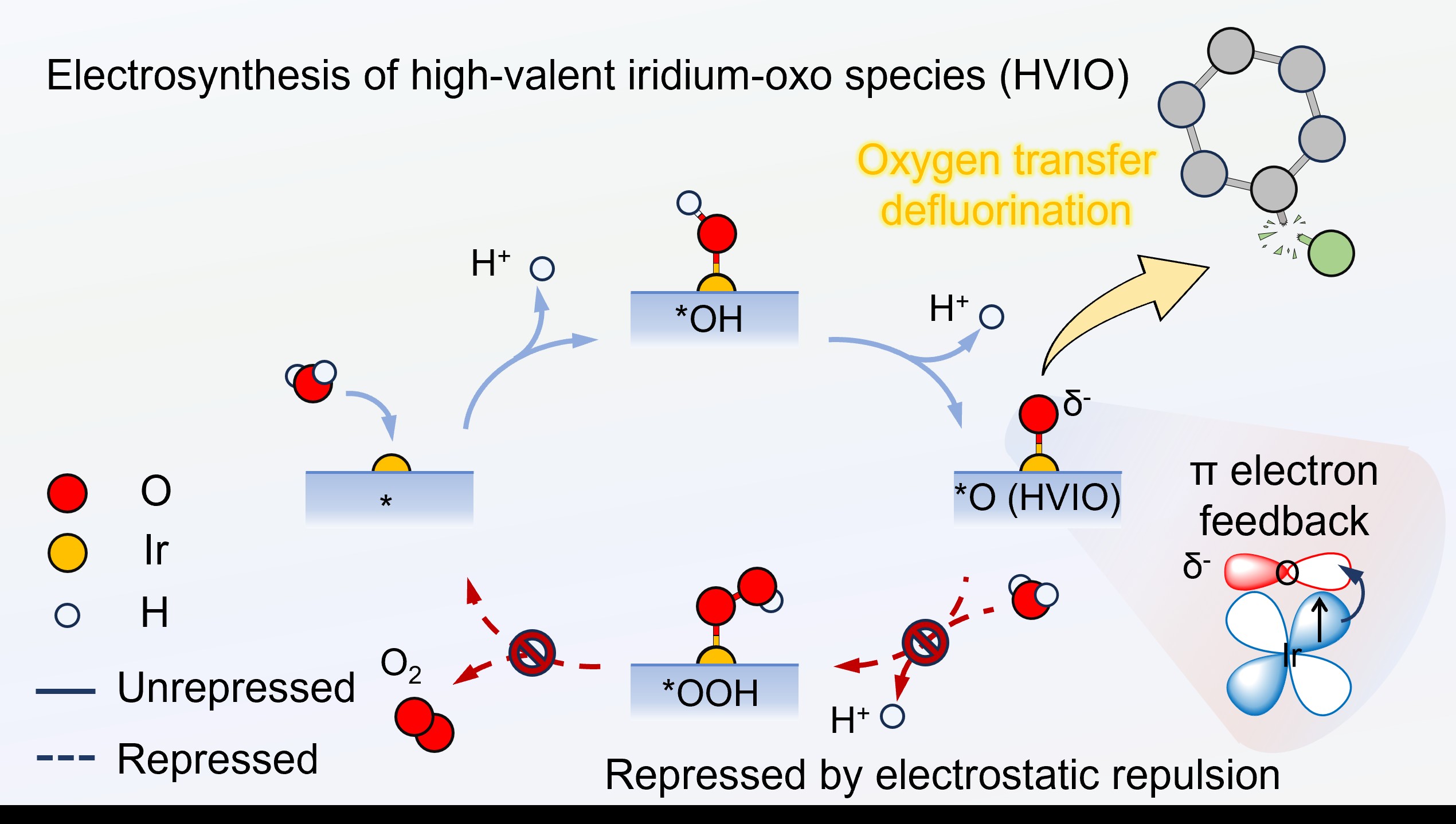 基于上述因素启发,该团队报道了一种无需氧化剂的电化学方法,利用钛阳极上低氧化态(+2.0)的铱单原子直接以H2O为原料合成高价铱氧物种(HVIO)。通过连续两步质子耦合电子转移后HVIO在低氧化态铱单原子(L-Ir1/TF)上生成,其较高的d电子数会增强从Ir 5d轨道向O 2p轨道的π反馈作用,使电荷密度集中于HVIO上的轴向O原子(图1)。增强的静电排斥力抑制了与同样具有负电性的H2O反应,因此稳定了HVIO并抑制了Ir−OOH的形成,最终实现了16920 μmol h-1 gIr-1的HVIO生成速率,是高氧化态(+4.3)铱单原子(H-Ir1/TF)的1.7倍。当应用到经典FOCs——氟康唑的脱氟过程中时,L-Ir1/TF催化生成的HVIO可以通过亲电加成选择性断裂C–F键,在5小时内实现99.4%的脱氟率(H-Ir1/TF的2.3倍,传统PbO2阳极的6.7倍)。理论计算揭示了高OTD效率源自L-Ir1/TF上HVIO的氧转移能力的提升,即下移的Ir 5dz2轨道促进了电子从C–F最高占据分子轨道(HOMO)向Ir=O的σ*轨道的转移。
