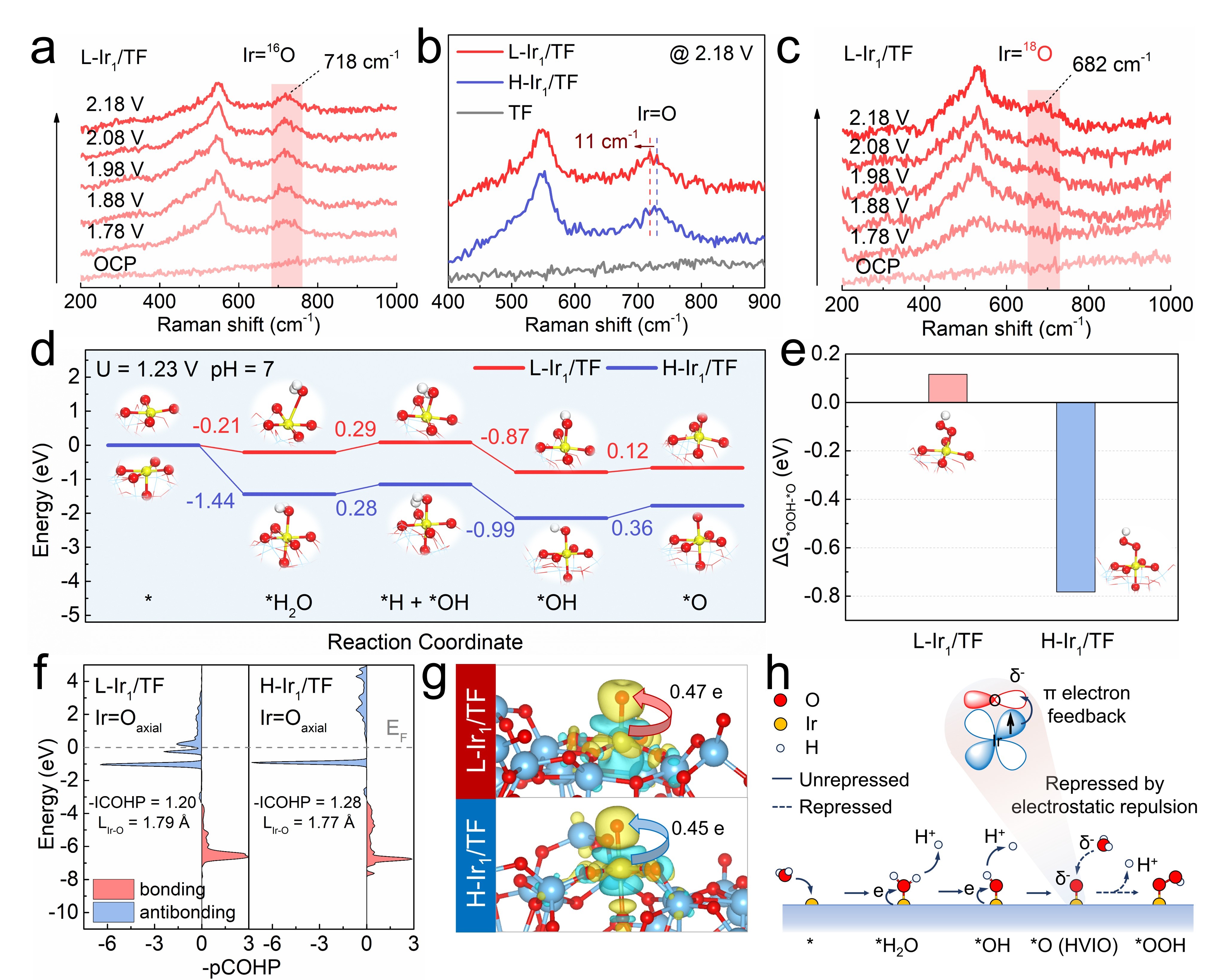 原位拉曼光谱(Raman)和同位素实验证实了HVIO上的氧来自于水。借助理论计算的手段发现,L-Ir1/TF上脱质子过程所需能量更低(0.12 eV),且被进一步氧化为Ir−OOH的能量更高,所以与H-Ir1/TF相比更容易生成HVIO(即*O),且更不易氧化为Ir−OOH。该团队将其归因于Ir 5d轨道向O 2p轨道的π反馈作用增强,进而增加了HVIO中轴向氧原子的电子密度,并通过静电排斥作用抑制了L-Ir1/TF中Ir–OOH的O−O键形成。这一推论得到了晶体轨道哈密顿分布(COHP)中费米能级下方呈现更强的反键填充以及轴向氧原子上更多的Bader电荷转移(0.47 e)的证实。