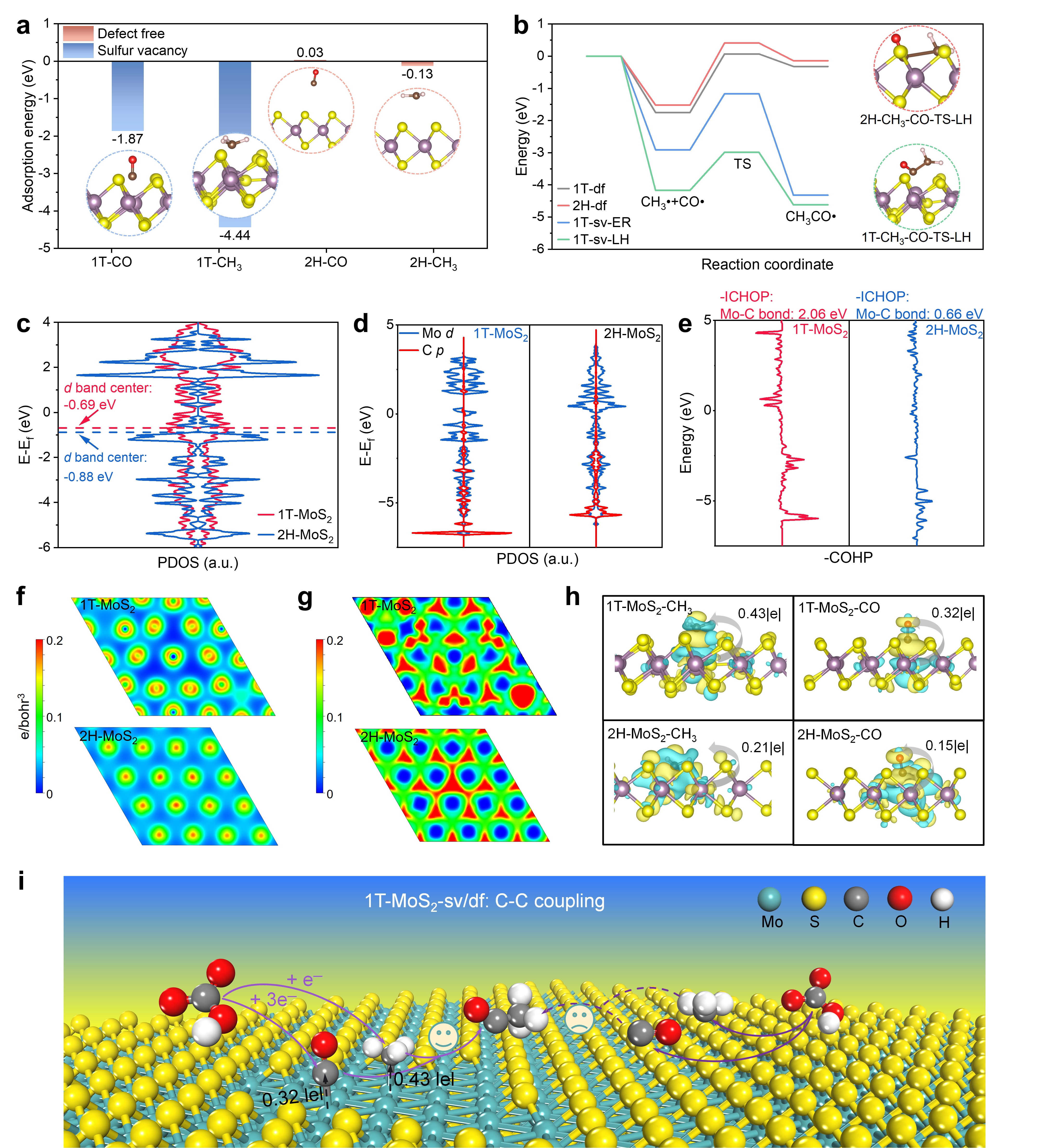 计算结果表明,硫空位的引入显著降低了CH3与CO耦合的活化能,其中在1T'-MoS2上的能垒仅为1.18 eV,远低于其他结构,表明其在C−C偶联反应中具有更高的动力学活性。此外,1T'相展现出更靠近费米能级的d带中心(−0.69 eV)和更低的工作函数,有利于电子从催化剂向碳物种高效转移,从而促进关键中间体的活化。Bader电荷分析进一步证实,1T'相能够向反应中间体传递更多电荷,增强了Mo−CH3之间的相互作用,揭示了其优异催化性能的电子结构根源。