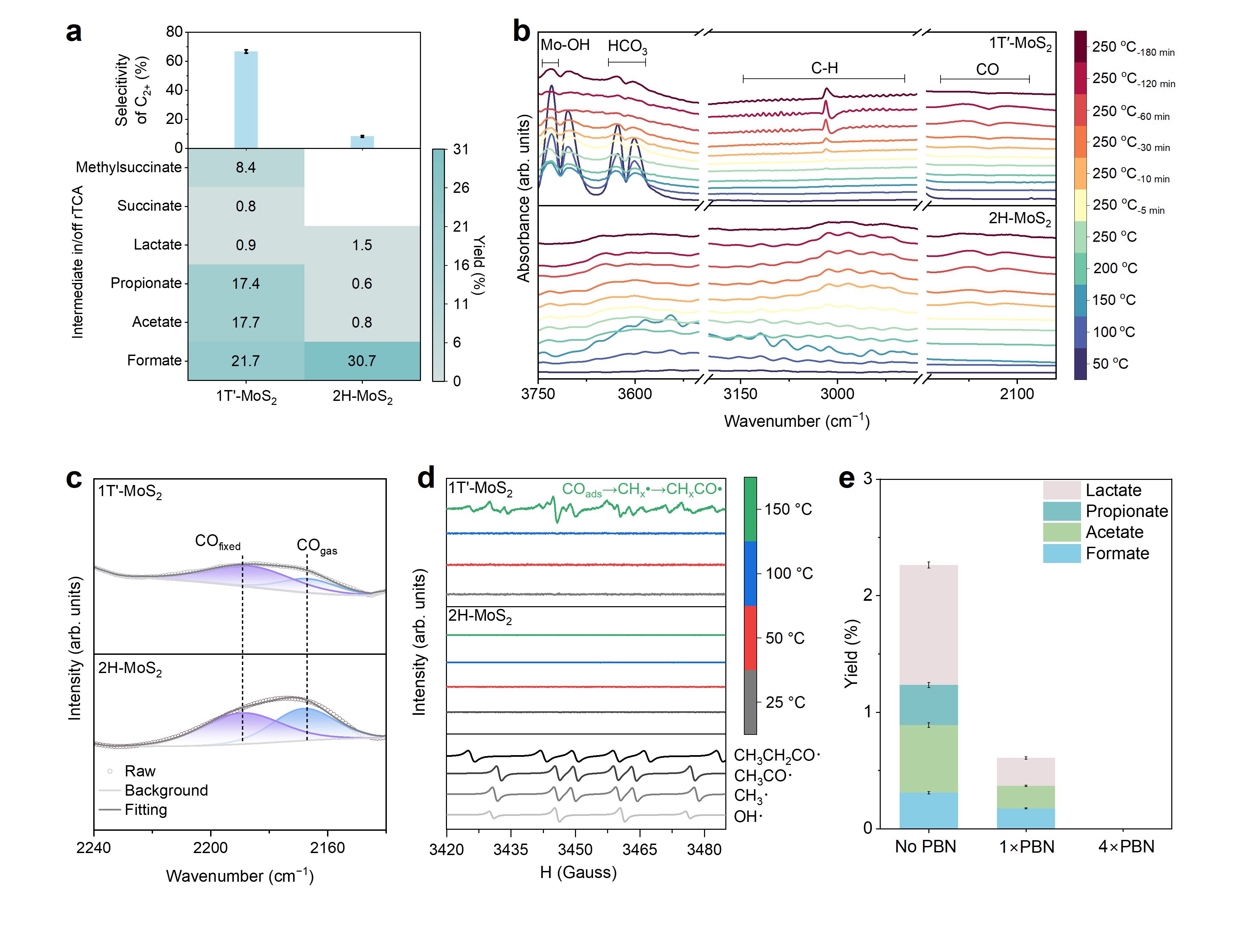 原位红外(DRIFTS)分析检测到1T'-MoS2表面存在特有的CHx吸附物种,该物种在2H相中完全缺失,揭示了1T'相在促进C−C耦合方面的结构优势。此外,EPR实验成功捕捉到甲酰基、乙酰基等关键自由基中间体的信号,表明反应过程遵循自由基介导的耦合路径。进一步通过加入自由基清除剂(PBN)进行抑制实验,观察到产物产率显著下降,从实验层面确证了自由基机制在C−C键形成中的关键作用。