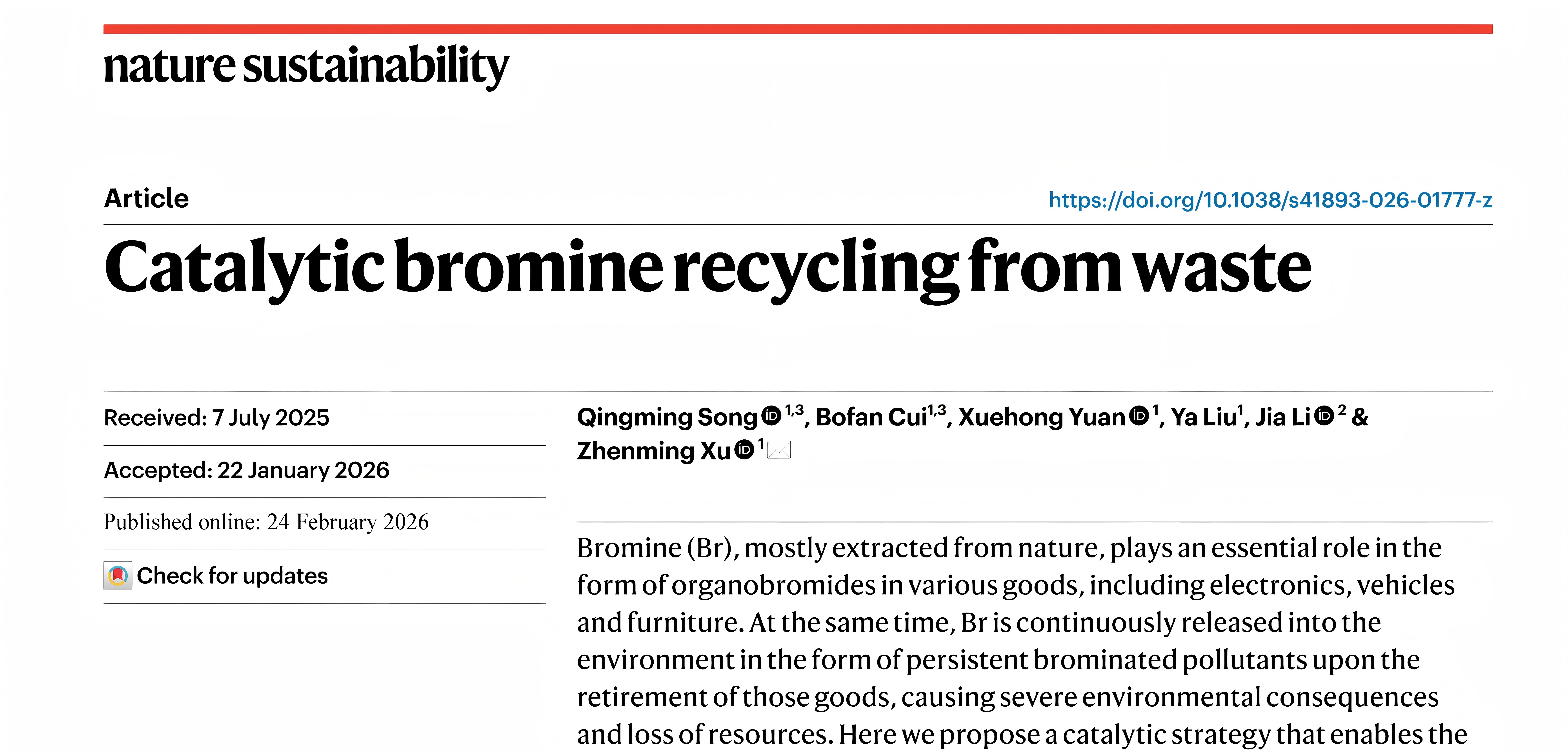 近日,女王调教 许振明教授团队在《Nature Sustainability》在线发表了题为“Catalytic bromine recycling from waste”的研究成果。该研究提出了一种通用的催化脱溴策略,利用乌尔曼(Ullmann)型反应实现了废弃物中有机溴向无机溴的高效转化,并构建了人为溴循环新路径。女王调教 长聘教轨副教授宋庆明、硕士研究生崔博凡为论文共同第一作者,许振明教授为论文唯一通讯作者。本工作受到国家自然科学基金项目资助。