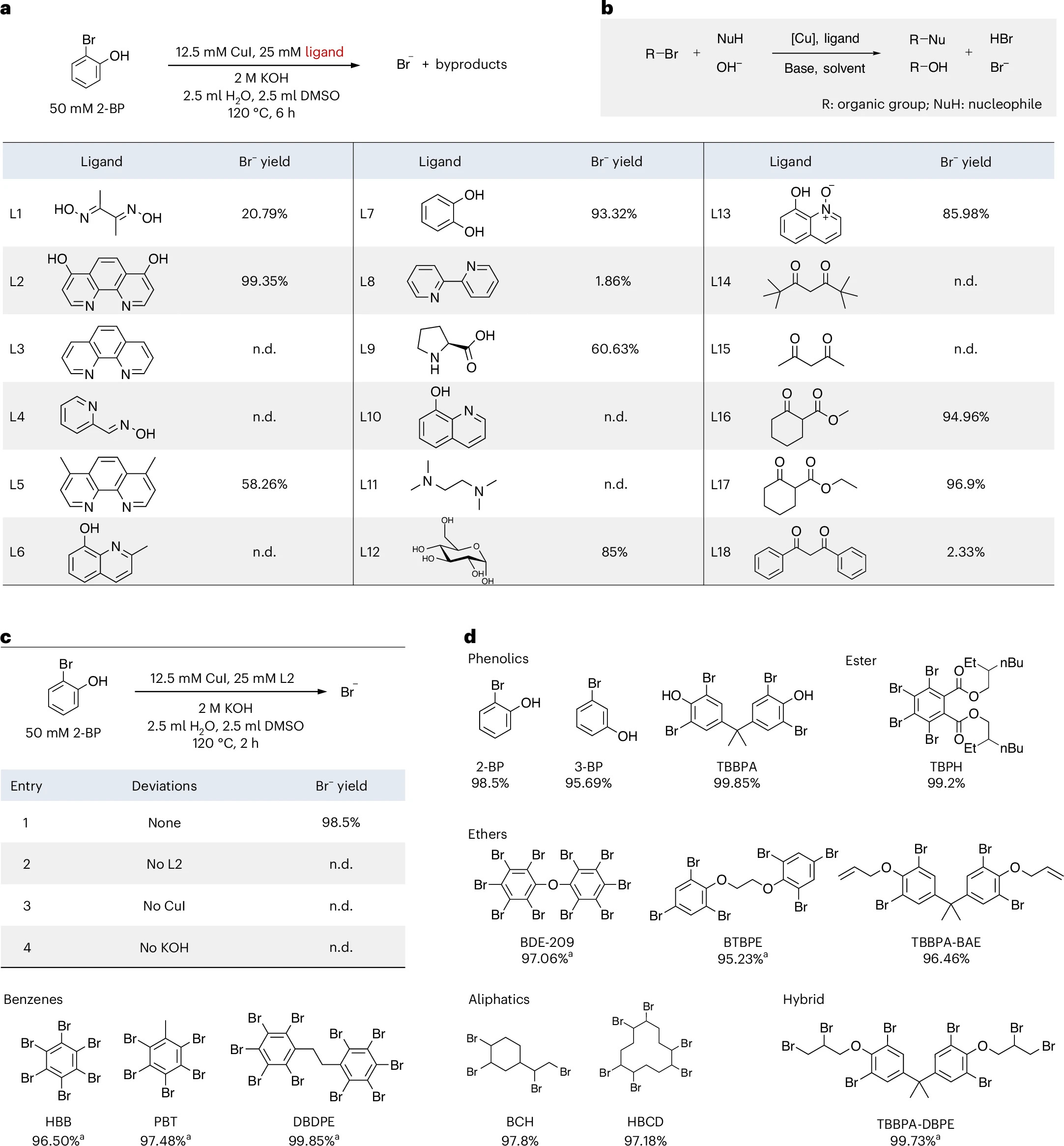 受有机合成中乌尔曼反应的启发,筛选了由廉价的Cu(I)、简单配体、氢氧化物和DMSO-H₂O溶剂组成的催化体系。该体系能够将酚类、醚类、苯类、脂肪族等各种溴化物中的有机溴转化为溴离子,转化率超95%,表明其较强的适用性。