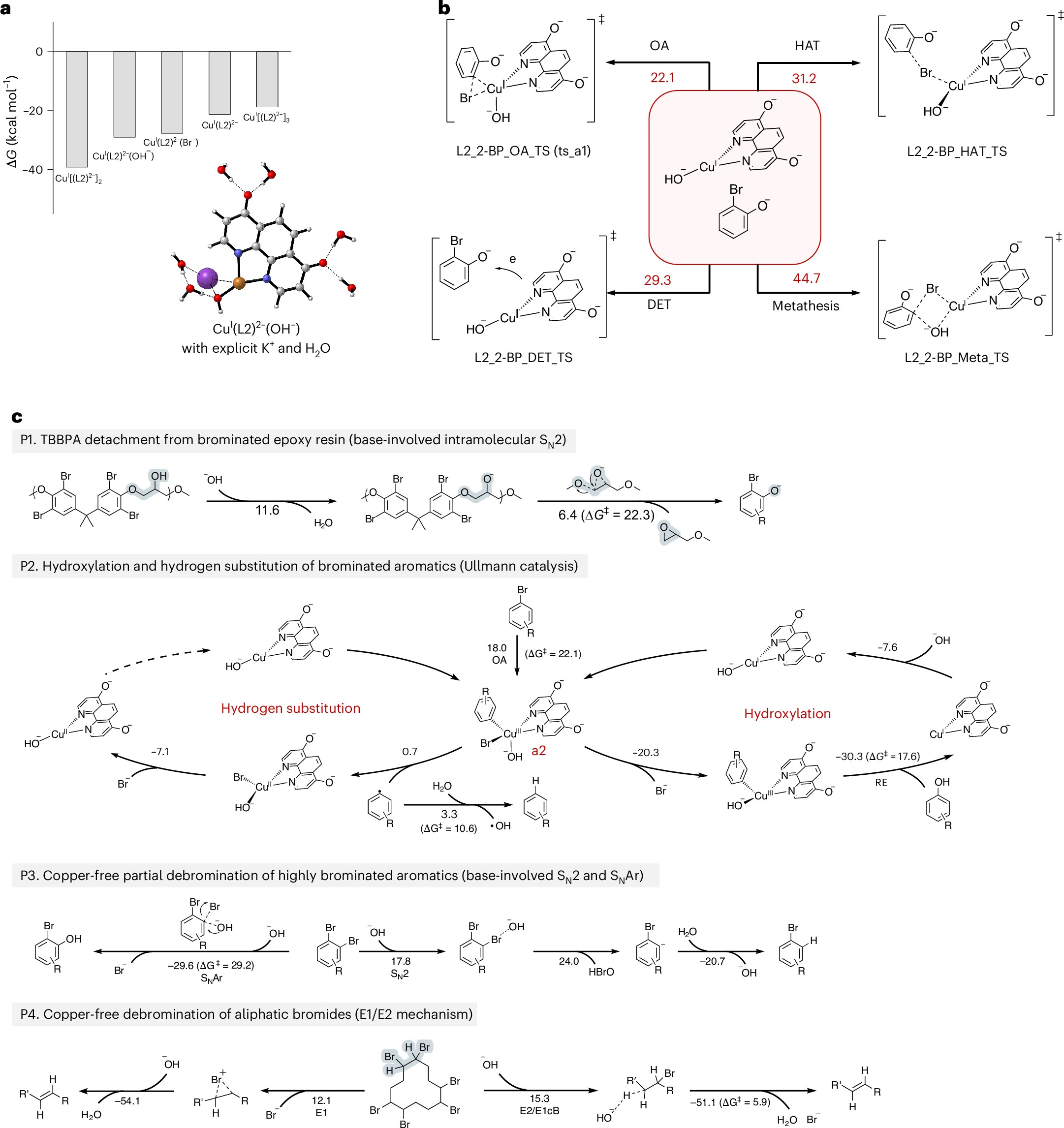 机理研究揭示了乌尔曼催化过程中可能的活性铜配合物、C-Br键活化路径,理论计算能垒与实验值接近。进一步阐明了可能的有机溴转化路径,包括氧化加成、溴离子解离、还原消除的羟基取代路径和氧化加成、苯酚自由基解离、质子转移的氢取代路径。