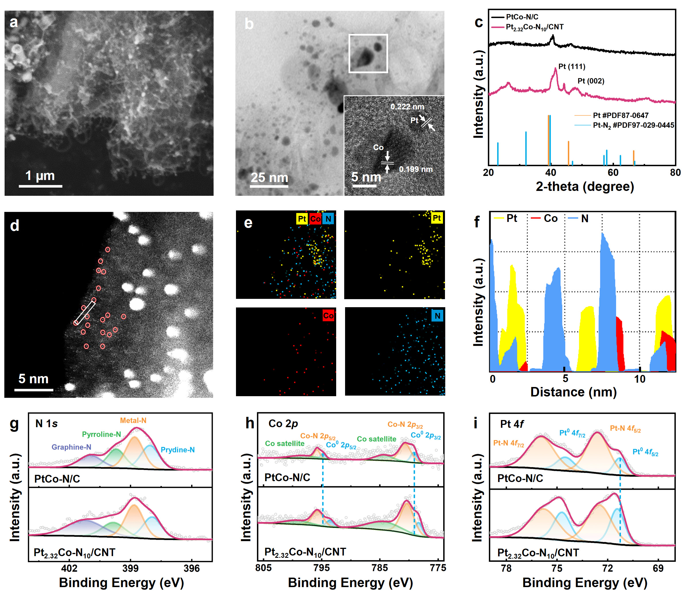 系列表征证实了电催化剂设计的成功(图2)。高角环形暗场扫描透射电子显微镜直观展示了Pt、Co、N元素在碳纳米管上的均匀分布与紧密结合。X射线光电子能谱则进一步证实,氮掺杂引发了电子从载体向Pt/Co金属中心的转移,优化了其电子结构,为高活性与抗中毒性提供了结构基础。