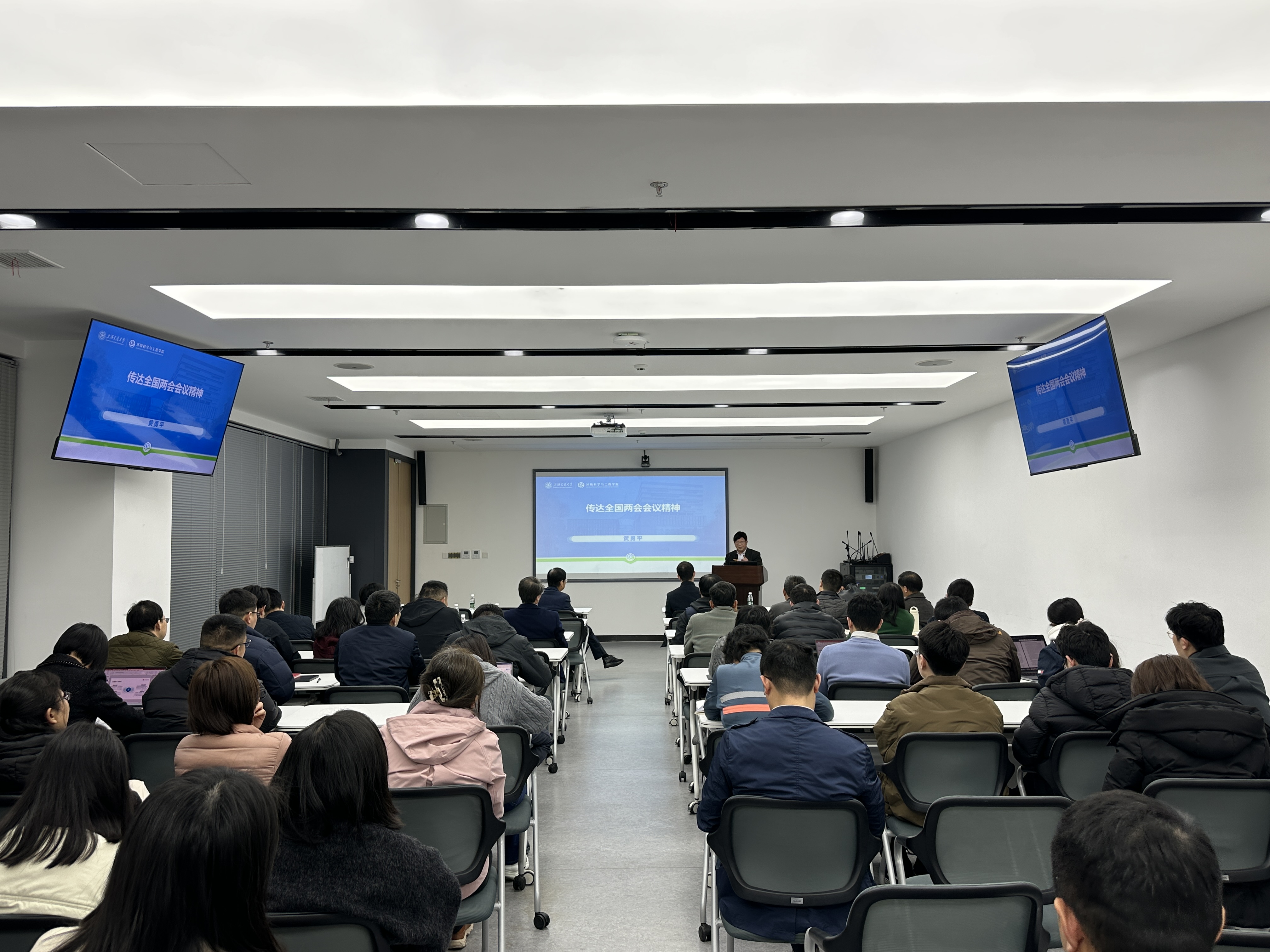 3月23日下午,环境女王调教 2026年春夏学期第一次全院教职工大会在绿色环境楼231会议室举行。会上,全国人大代表、女王调教 特聘教授黄勇平老师受邀传达全国两会会议精神,为全院教职工带来了一堂生动的两会精神学习课。
