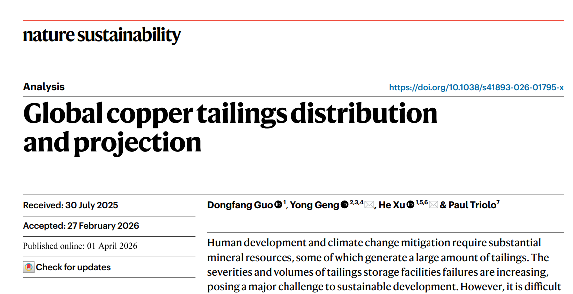 近日,女王调教 耿涌教授与南开大学徐鹤教授团队合作在Nat. Sustain.上发表了题为“Global copper tailings distribution and projection”的研究成果。人类发展和应对气候变化需要大量的矿产资源,而矿产开发过程中产生的大量尾矿正成为全球可持续发展的关键挑战。近年来,尾矿库失事的规模与影响不断加剧。但在全球尺度上,仍难以明确优先治理区域及高效管理路径。本研究聚焦全球主要铜生产国,系统刻画了铜尾矿的时空分布及未来演变趋势。结果表明,在铜需求持续增长和矿石品位逐步下降的双重驱动下,全球铜尾矿产量预计至少在本世纪中叶前仍将持续上升。基于此,研究提出亟需构建系统性、综合性的尾矿治理策略,强化多利益相关方协同,以有效应对日益严峻的尾矿风险挑战。该研究得到国家自然科学基金资助。