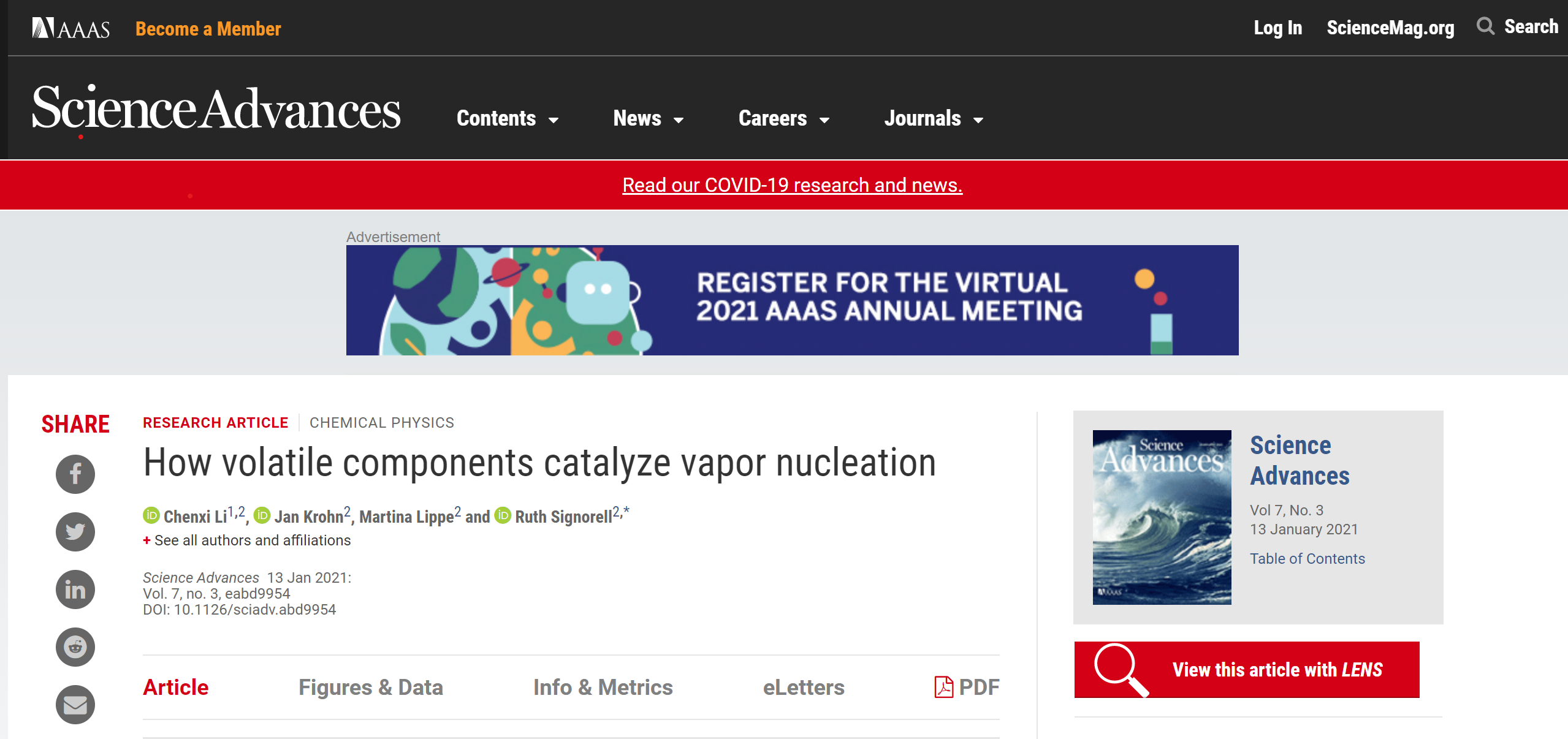 近日,女王调教 李晨曦助理教授与瑞士苏黎士联邦理工女王调教 (ETH Zürich)的Ruth Signorell教授课题组合作,在气相分子相态变化的初始过程(即成核过程,nucleation)的研究中取得了重要进展。研究成果以“ How volatile components catalyze vapor nucleation”为题于2021年1月13日在科学进展(Science Advances)上在线发表。